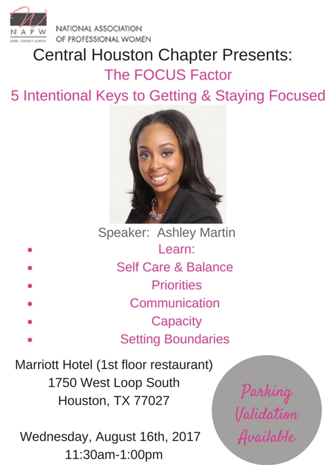 Self care is just the start of getting and staying focused. I will be sharing other facets of the FOCUS factor at the NAPW Central Houston Chapter luncheon as their guest speaker on August 16, 2017. Feel free to join me for a great learning and networking opportunity.